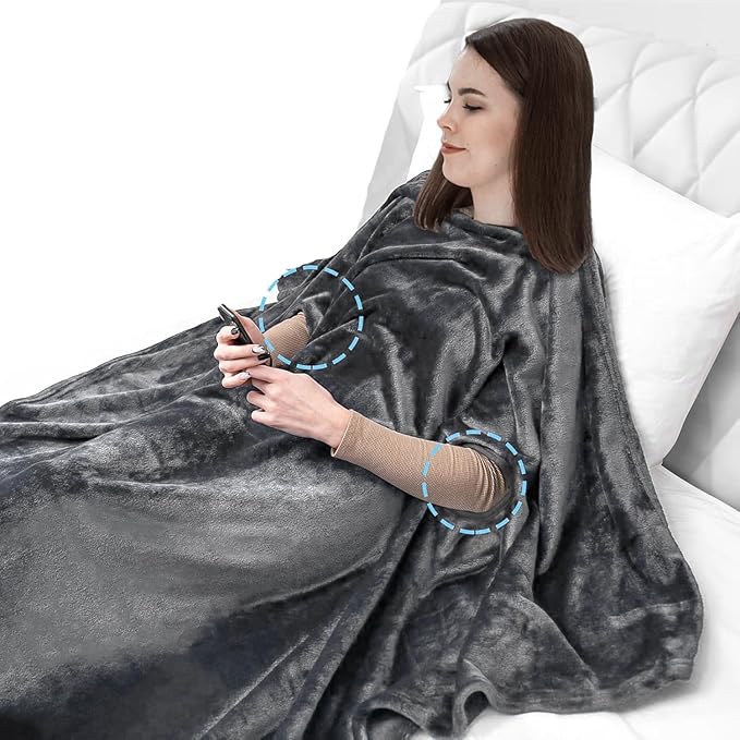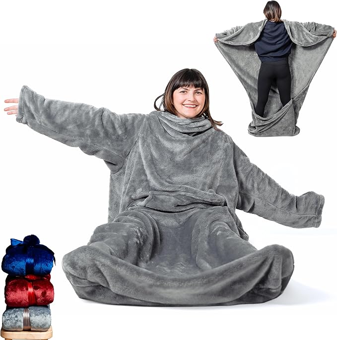 Giant Plush Fleece Blanket with Sleeves and Foot Pocket - Patent Pending - 75x55IN XXL Premium Throw - Gifts for Men Who Want