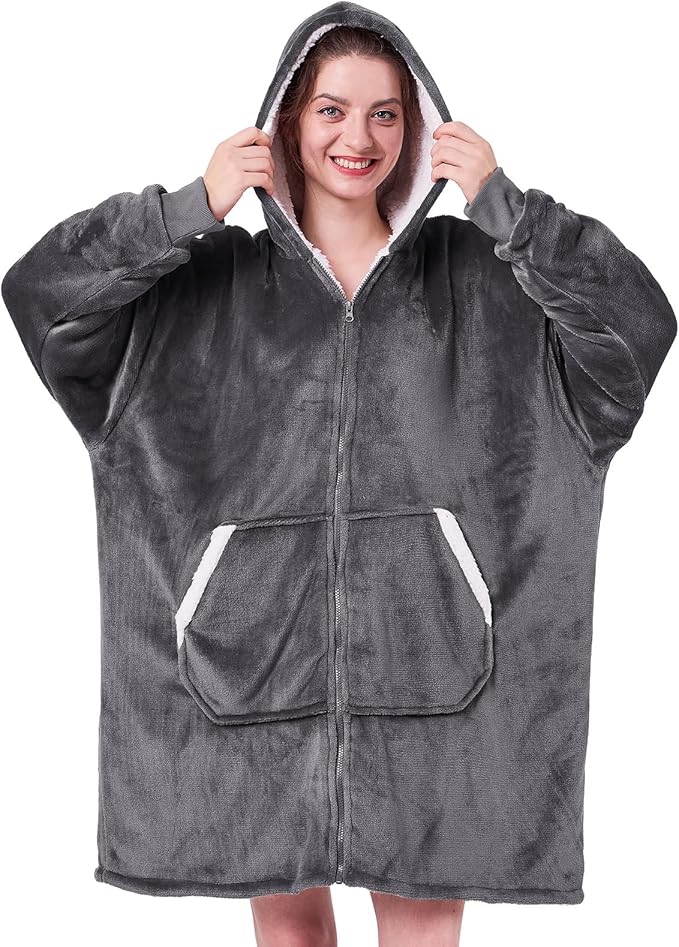 Wearable Blanket Hoodie Gifts for Women - Cozy Sherpa Hoodie Blanket for Adult Men, Warm Hooded Blanket Sweatshirt, Grey