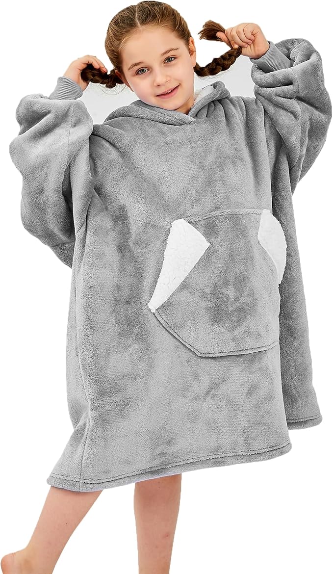 Wearable Blanket Hoodie for Kids, Sherpa Oversized Sweatshirt Blanket Flannel with Hood Pocket and Sleeves (Grey)