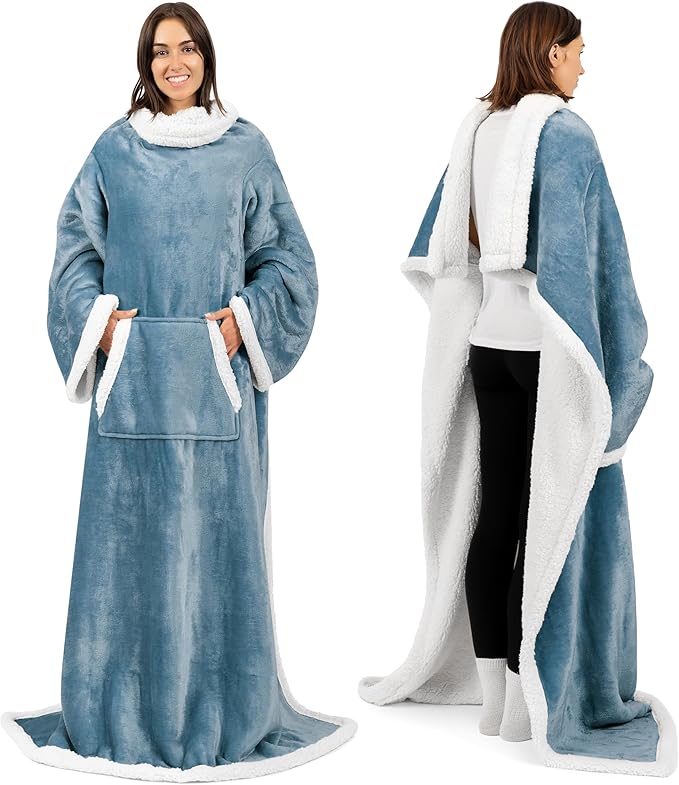 Wearable Blanket, Cozy Loungewear Pocketed Plush Cape Wrap for Adults & Teens(Hazy Sky Blue, One Size 58"X64")